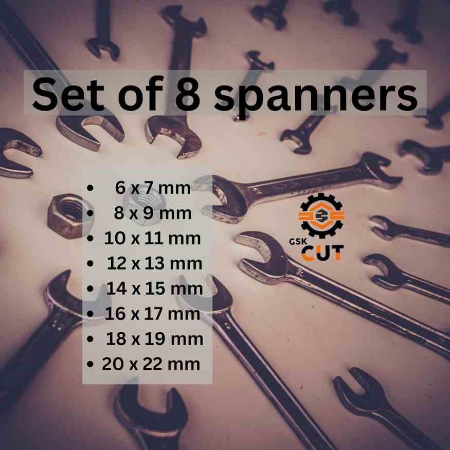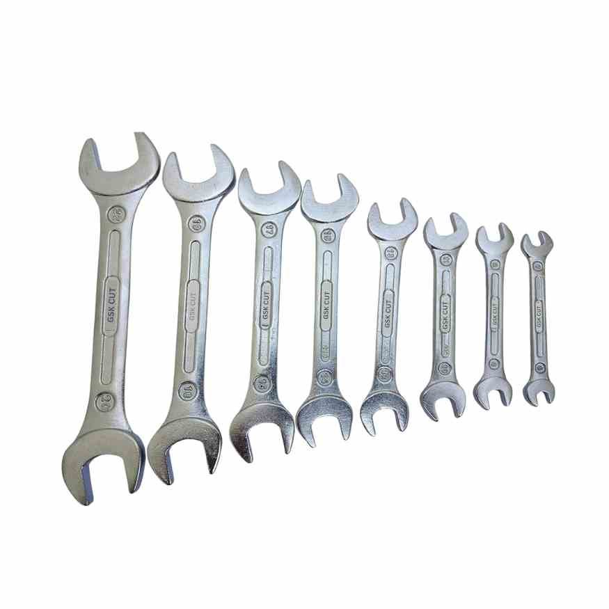 8-piece double open end spanner set made of chrome vanadium steel with nickel chrome finish. Rust-resistant, durable, and ideal for home, garage & professional use.