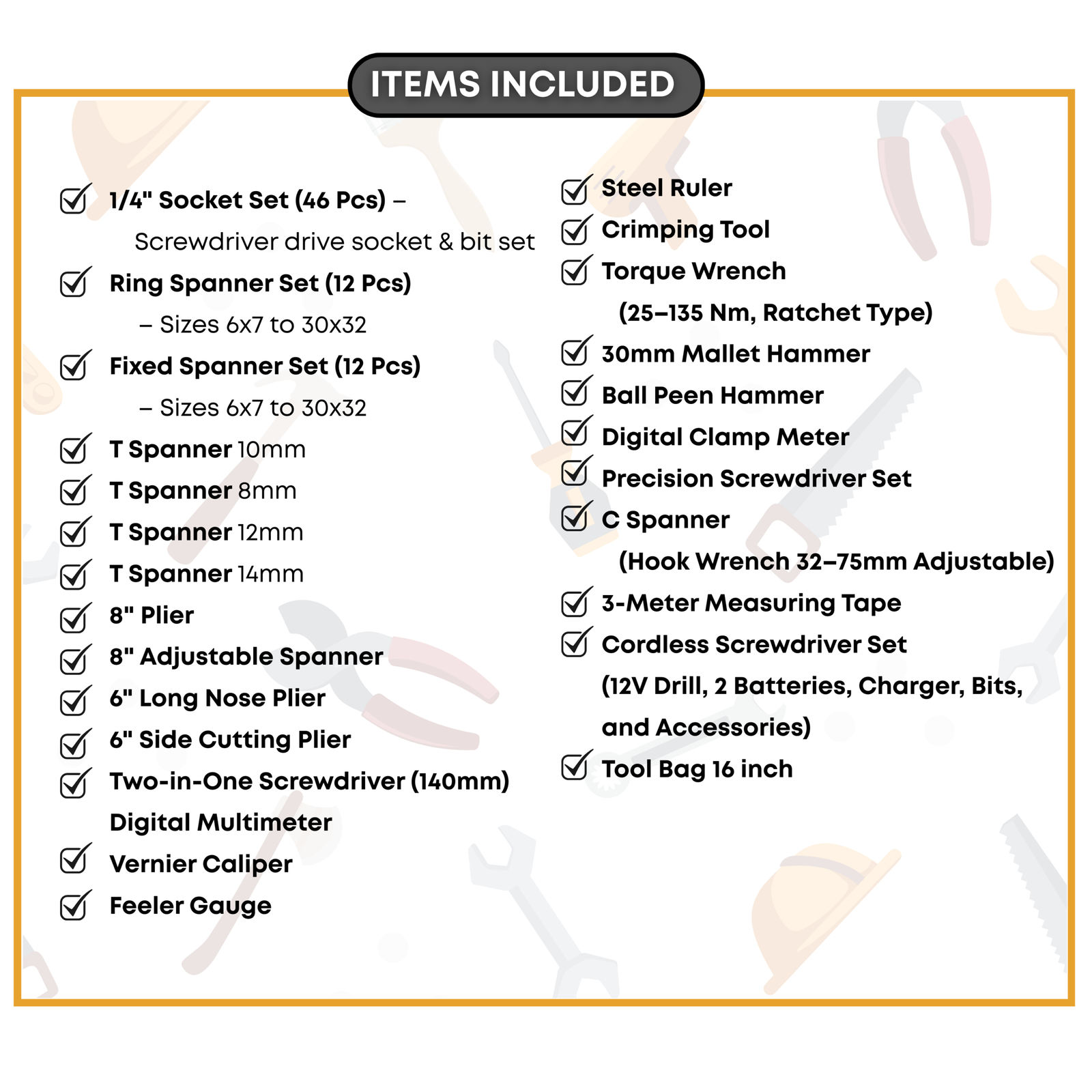This comprehensive kit covers hand tools, power tools, electrical testing equipment, and precision measuring instruments. Whether you are performing mechanical repairs, electrical diagnostics, fabrication work, or general maintenance, this collection delivers reliability and performance.