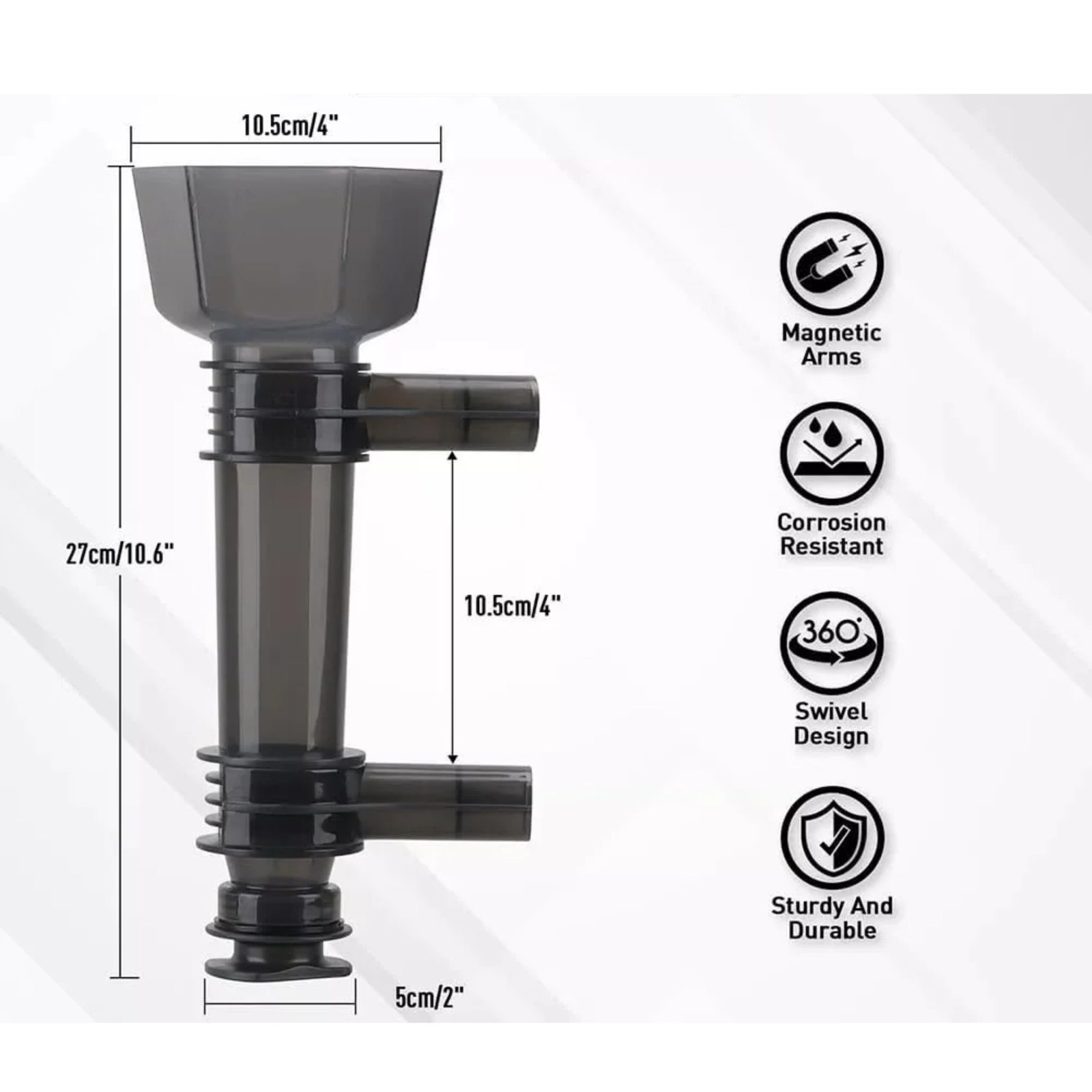 This funnel holder features a strong magnetic base that attaches firmly to metal surfaces such as vehicle frames, engine bays, tool cabinets, or machinery bodies. The magnetic support keeps the funnel stable during use, preventing accidental tipping or movement.